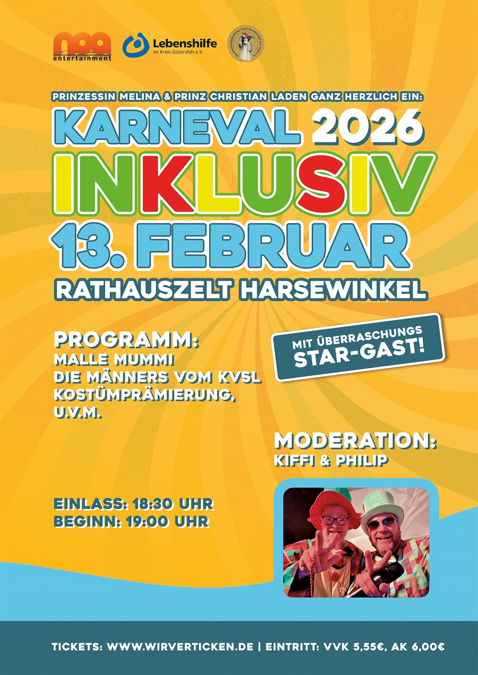 Am 13. Februar 2026 wird Harsewinkel wieder bunt, laut und vor allem inklusiv. Prinzessin Melina und Prinz Christian laden zum großen Karneval Inklusiv ins Rathauszelt ein – mit Musik, Kostümen, guter Stimmung und vielen Überraschungen.